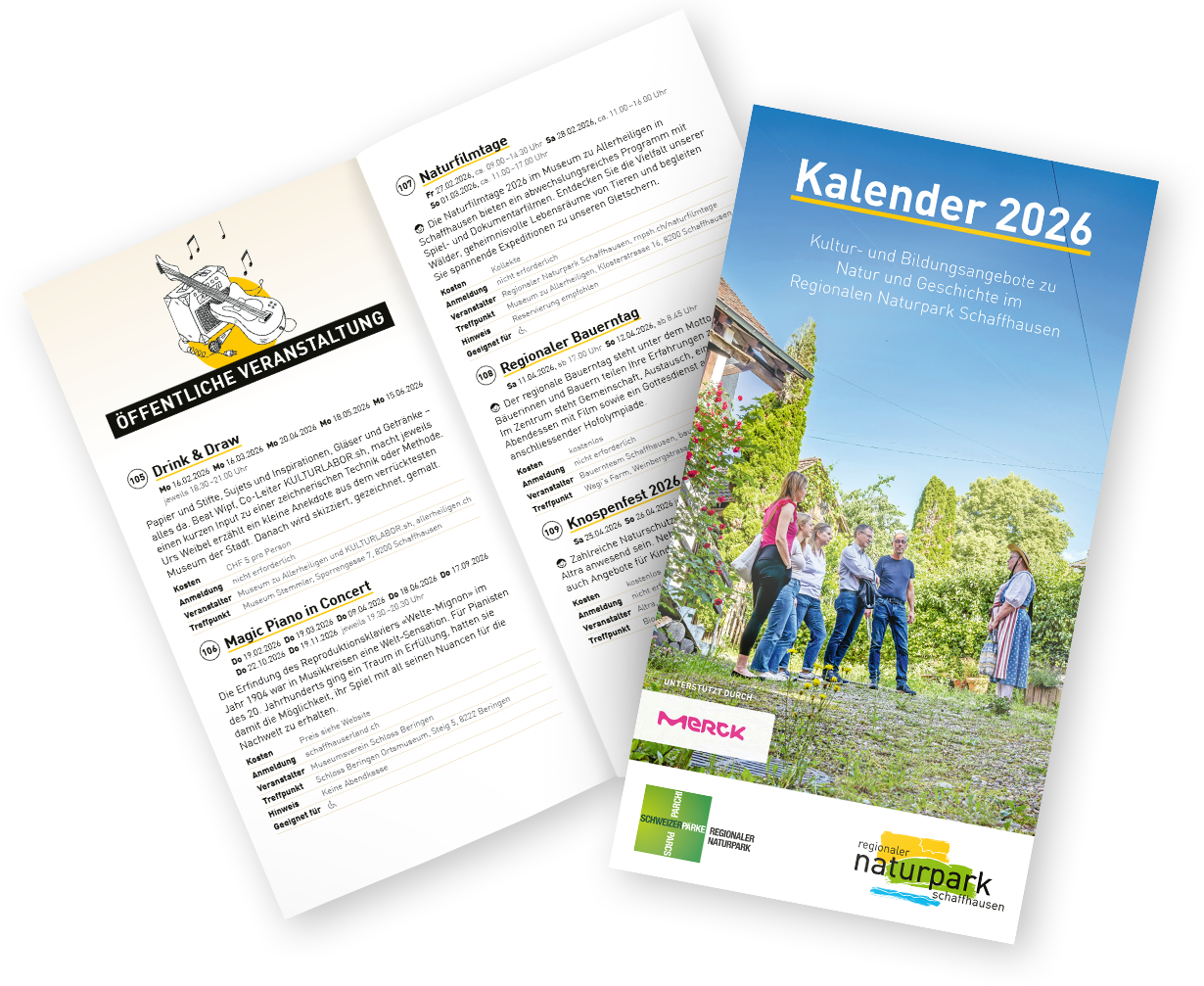Zahlreiche Organisationen und Exkursionsleitende bieten spannende Angebote an, bei denen Sie mehr zur Natur, Kultur und Geschichte des Regionalen Naturparks Schaffhausen erfahren können. In einem Jahreskalender werden Kultur- und Bildungsangebote zu Naturparkthemen präsentiert. Der Kalender wird als Broschüre jedes Jahr im Februar erstmals mit einer Auflage von 44'000 Exemplaren gedruckt und in alle Haushalte im Naturpark verteilt. Darüber hinaus wird er an stark frequentierten Orten aufgelegt, an Messen verteilt und ist als Download auf der Website verfügbar. Der Kalender bietet eine Begleitung durch das ganze Jahr.