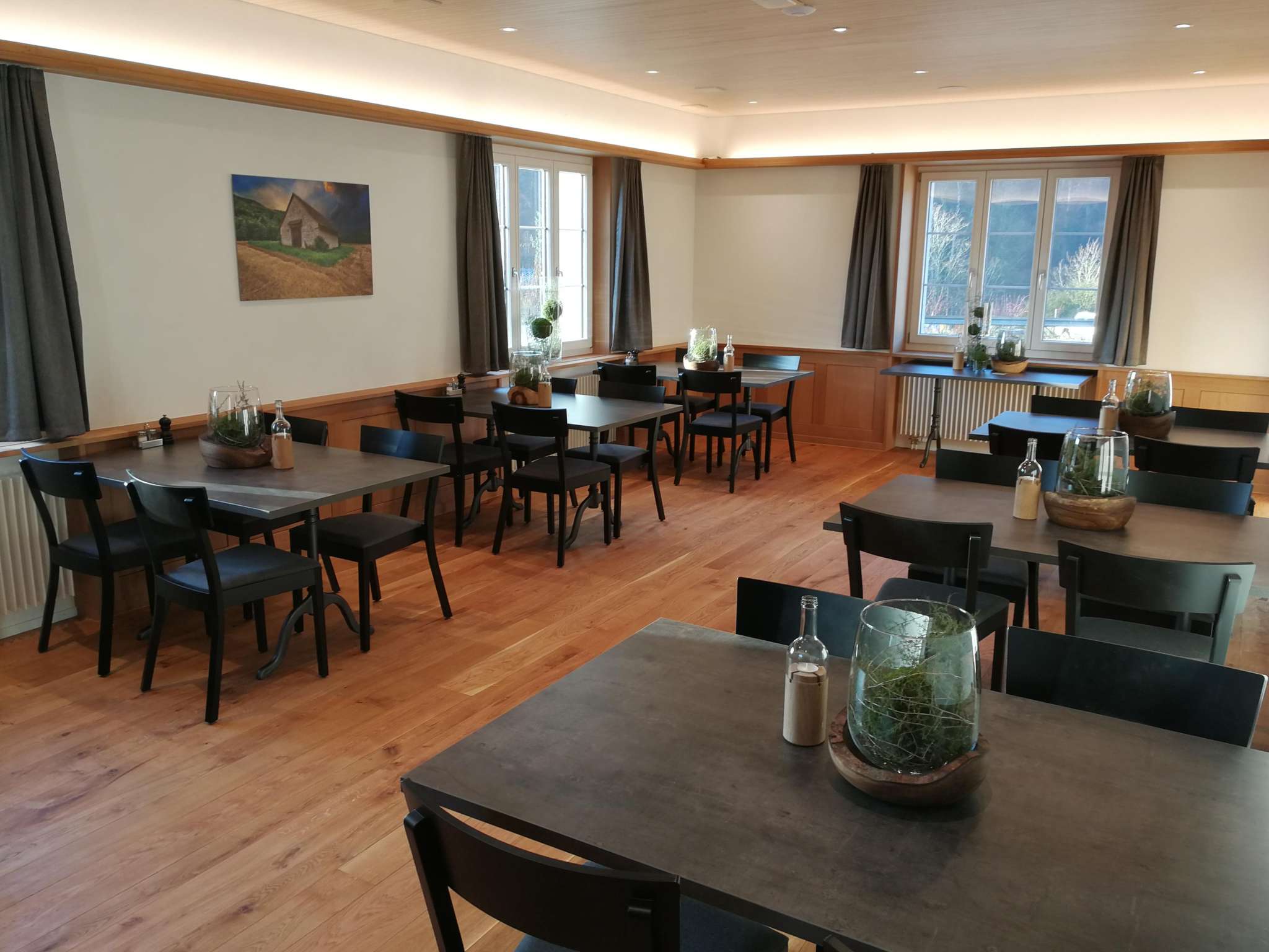 Neben der Gaststube mit Cheminée befinden sich im Erdgeschoss das Längenbergstübli und das urchige Angusstübli. Im ersten Stock finden Sie den Saal (bis ca. 120 Personen) mit direktem Zugang zum Aperoplatz und der Festscheune. Ebenfalls im 1. Stock befindet sich der Seminar- und Sitzungsraum.