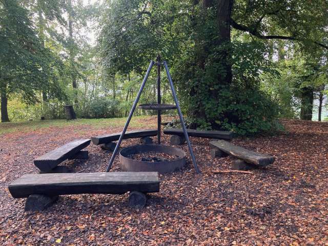 Gemütliche Feuerstelle im Wald mit Sitzbänken und Grillrost. Daneben befindet sich ein Spielplatz. Die schlichte Hurbighütte kann gemietet werden (ohne Inneneinreichtung).