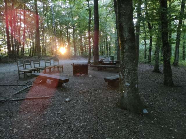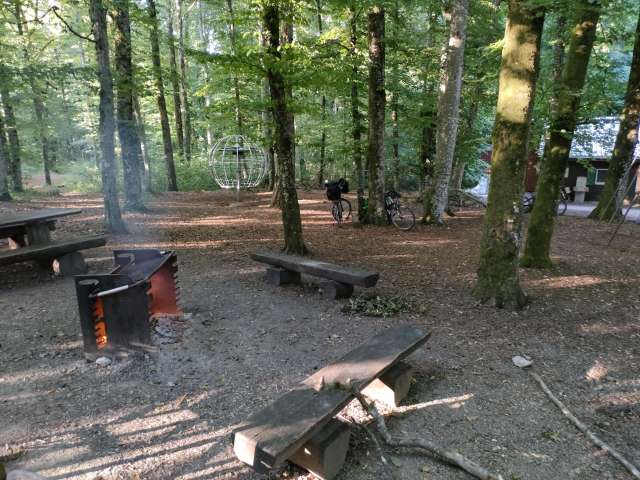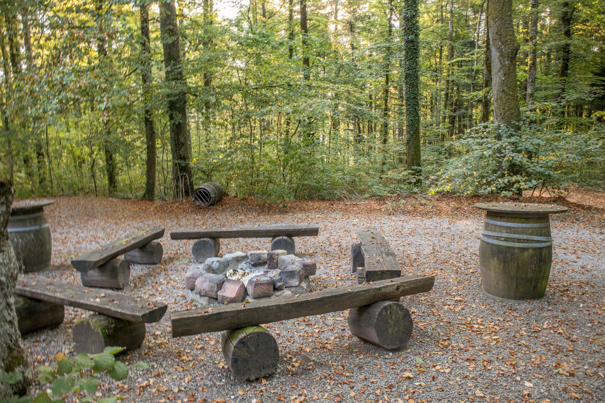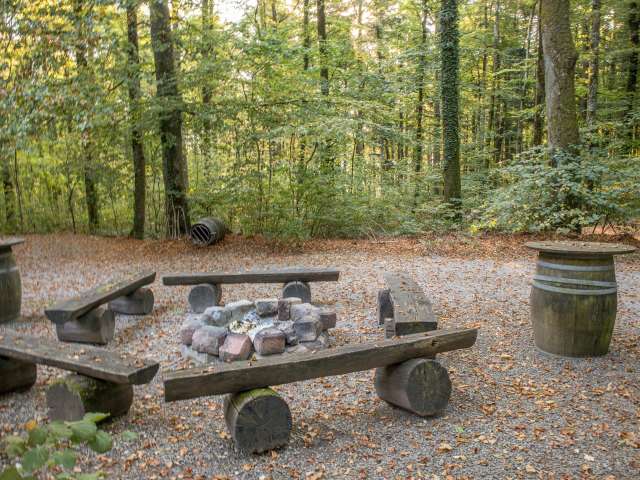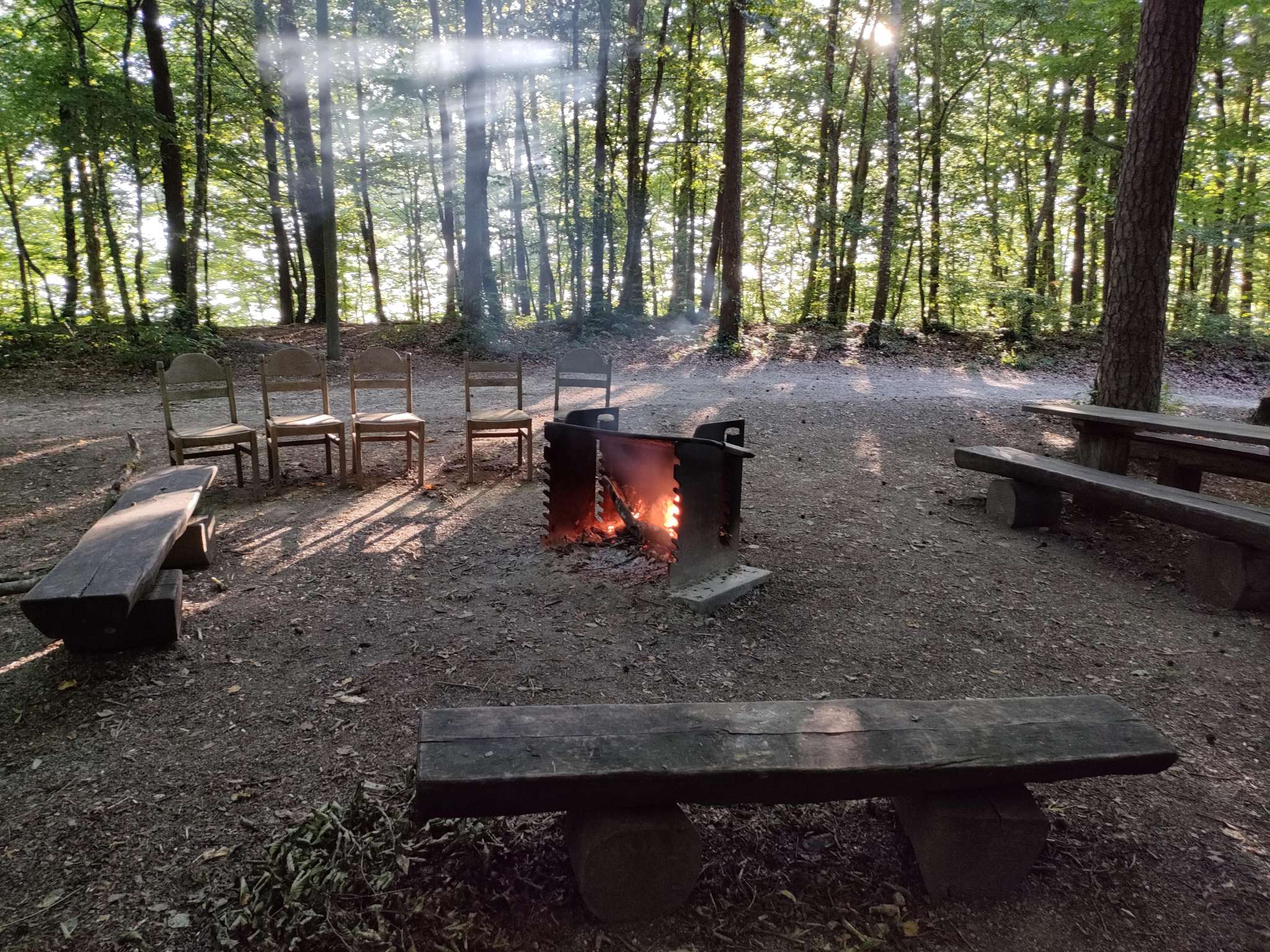 Die Grillstelle liegt beim Beringer Randenturm. Es hat eine Feuerstelle, mehrere Sitzmöglichkeiten und einen kleinen Spielplatz.