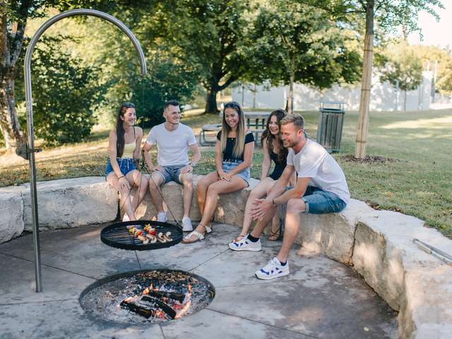 Innerhalb des Freibadgeländes des KSS Sport- und Freizeitparks, leicht erhöht mit Sicht auf die ganze Anlage. Tisch und Bänke befinden sich gleich nebenan. Ein Grill und Holz stehen zur Verfügung.
