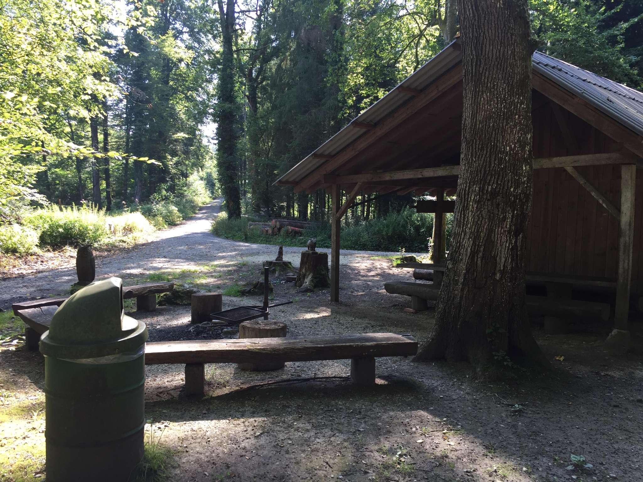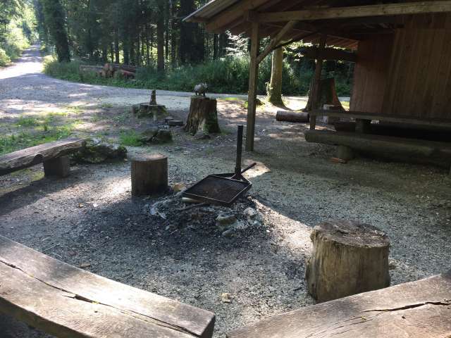 Die Grillstelle hat eine Feuerstelle mit Bänken rundherum. Daneben steht eine Hütte mit einem Unterstand, der genutzt werden kann.