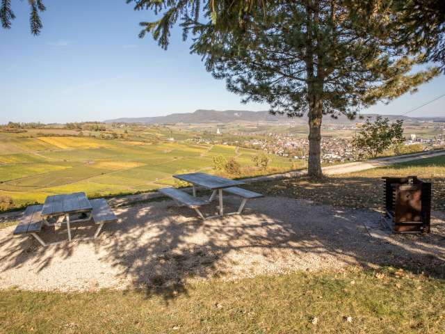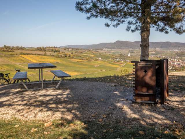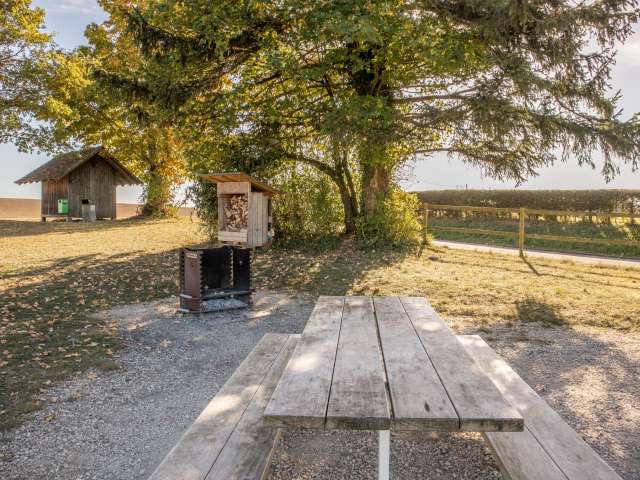 Neben einer Feuerstelle, zwei Tischen mit Bänken sowie schattenspendenden Bäumen hat es auch Holz (ohne Gewähr).