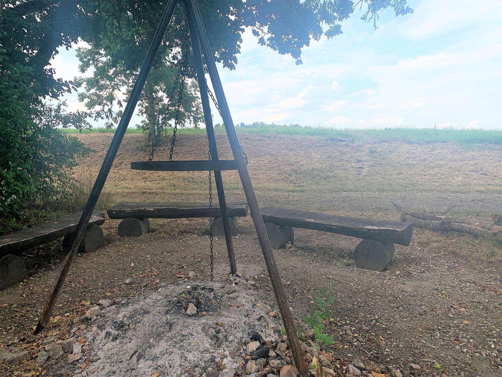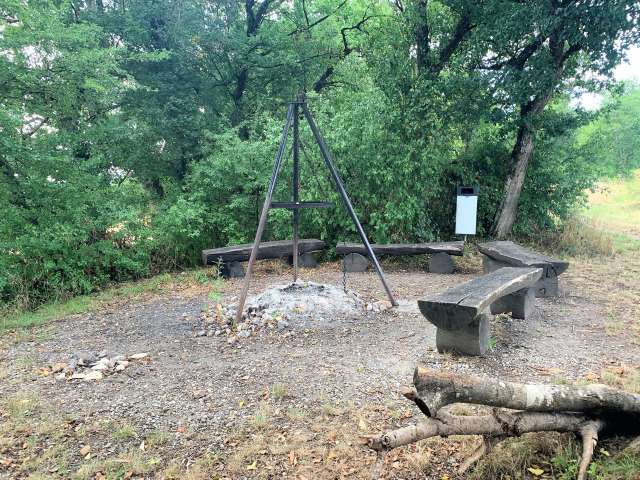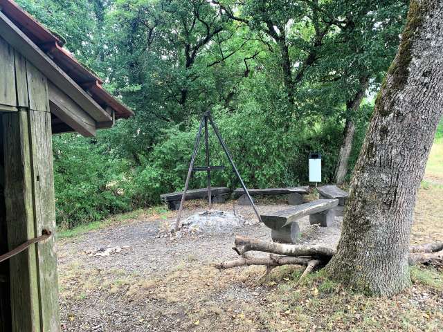 Die Grillstelle Rummele in Oberhallau hat eine offene Feuerstelle mit fünf Holzbänken rundherum. Daneben steht eine kleine Holzhütte mit einem Unterstand.