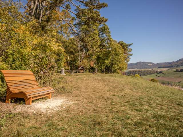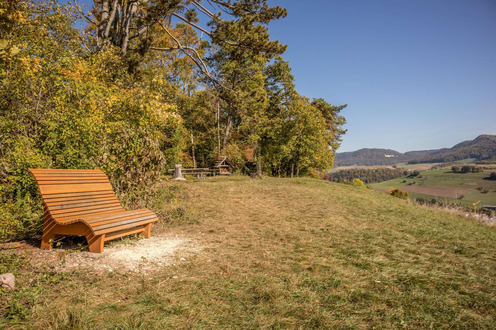 Die Holz-Liegebank lädt zum Aussicht geniessen und Sonne tanken ein.