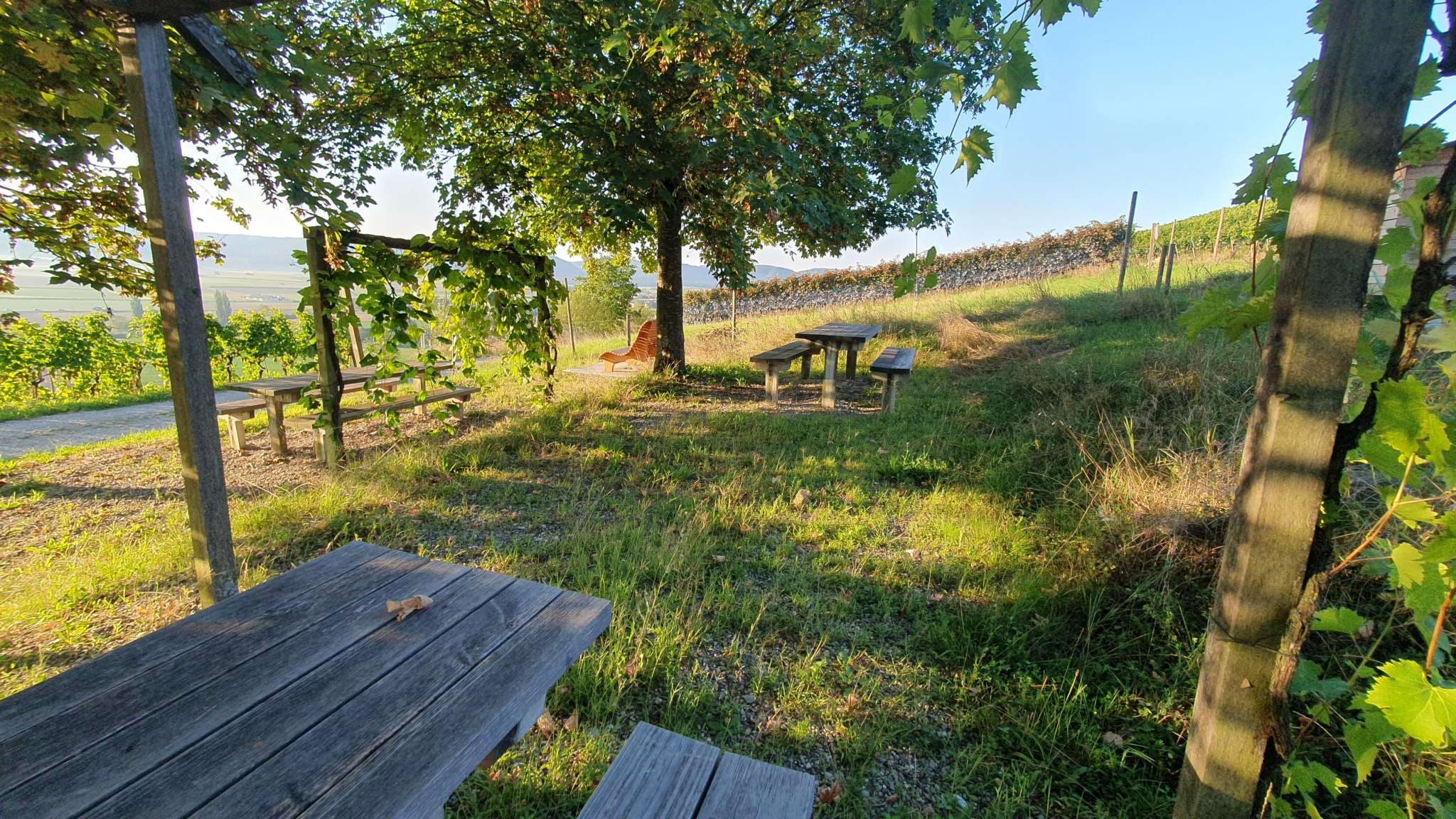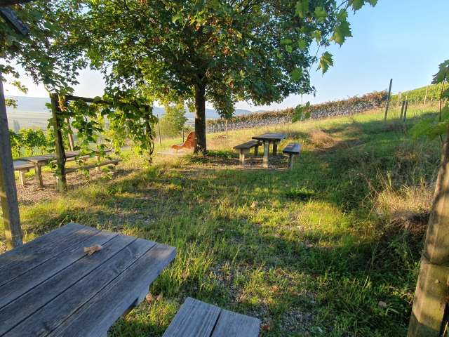 Zwei Tische mit Bänken, Pergola mit Tisch, fantastische Aussicht