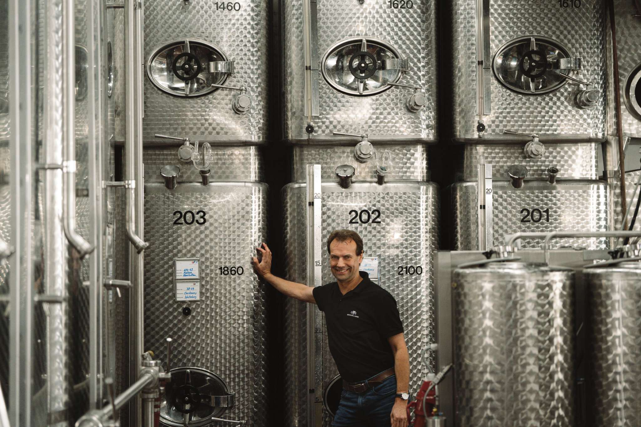 Seit 1995 verantwortet Kellermeister Michael Fuchs den Ausbau der Weine. Aufgewachsen auf einem Weingut in Baden bringt er viel Erfahrung und ein feines Gespür für die verschiedenen Lagen und Terroirs der Region mit. Für sein langjähriges Engagement für den Schaffhauser Wein wurde er 2025 als «Blauburgunder des Jahres» ausgezeichnet. Gemeinsam mit seinem Team aus Weintechnologen, Lernenden und Mitarbeitenden in der Abfüllerei entstehen in unserer Kellerei über 50 verschiedene Weine.