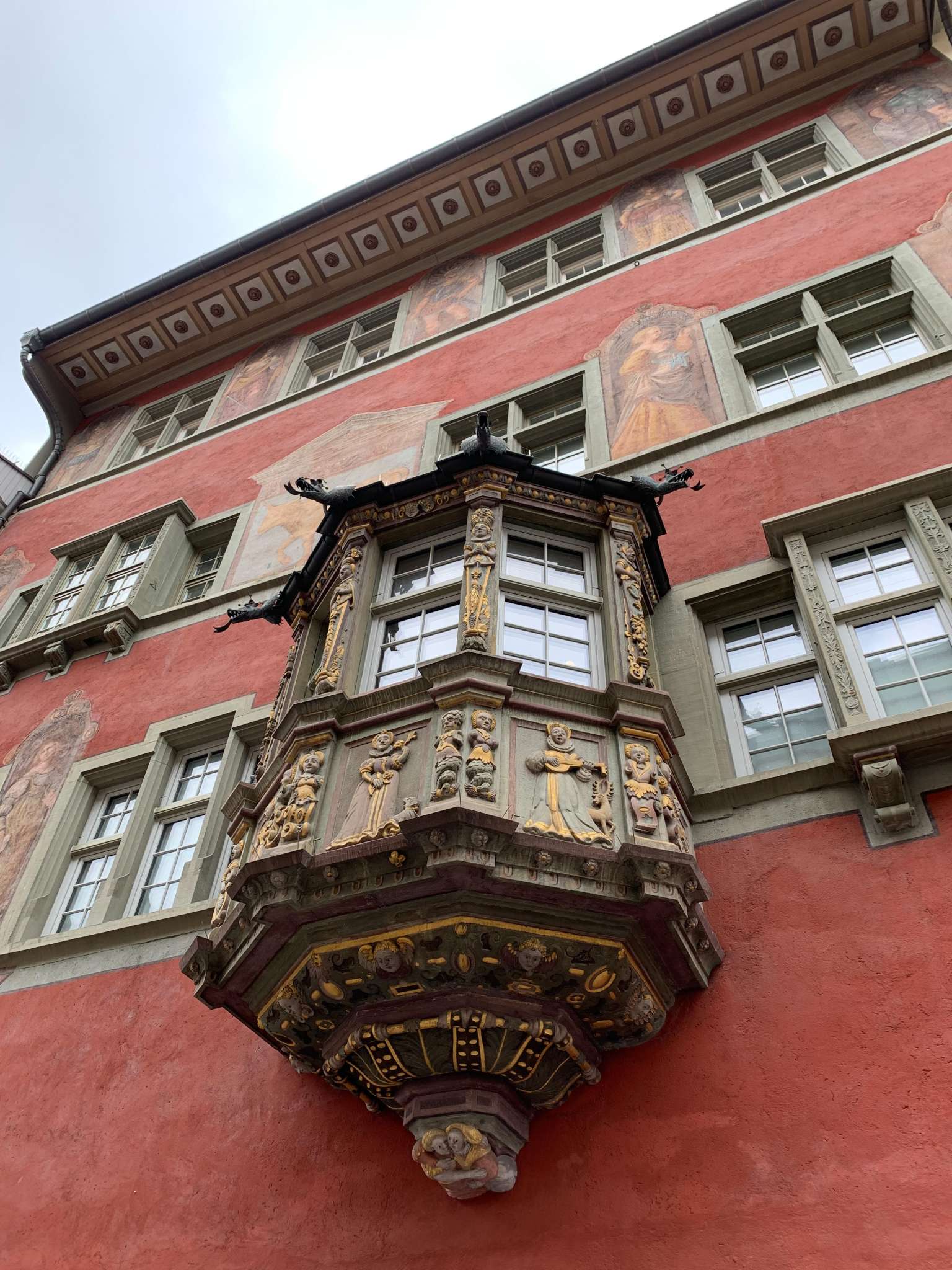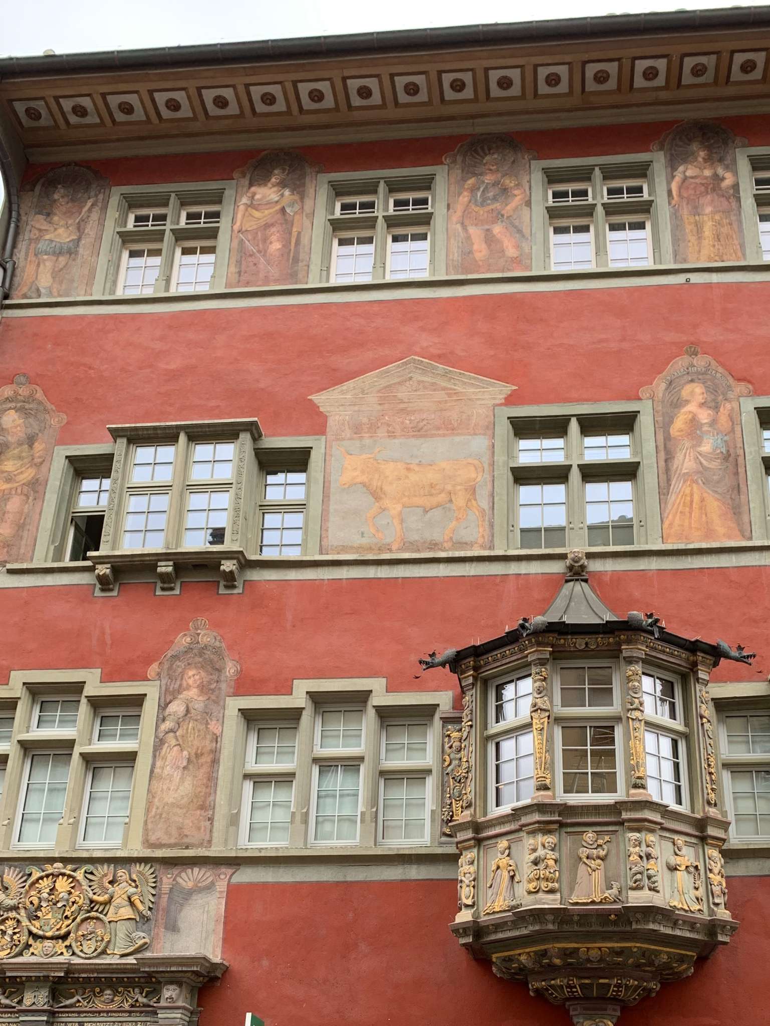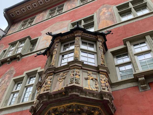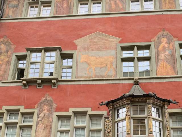 17. Jahrhundert. Eines der grossartigsten Häuser des alten Schaffhausen, am ehemaligen Rindermarkt gelegen. Es diente u.a. bis 1608 auch als Gastherberge. Beim Umbau 1608 in ein vornehmes Bürgerhaus bekam die spätgotische Fassade den Prunk deutscher Renaissance in Form von Erker und Portal. Die Fresken an der Fassade zeigen einen goldenen Ochsen als Haus zeichen und Personen aus der babylonischen Geschichte und der griechischen Antike. So vor allem die Helden aus dem Trojanischen Krieg.