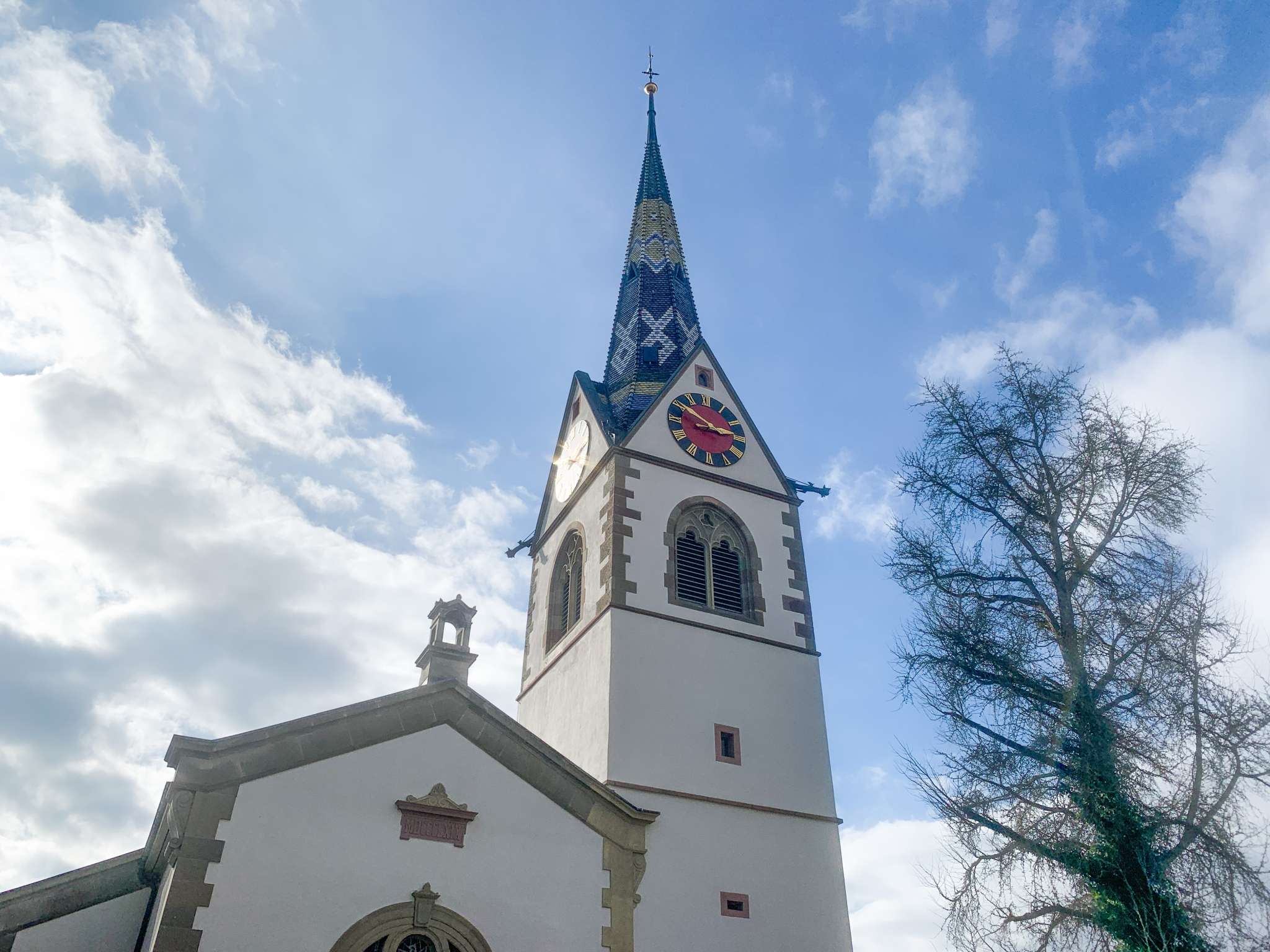 1901 wurde der spitze Kirchturm erstellt, der heute durch seine farbigen Ziegelmuster auffällt. Dabei wurde auch das vierstimmige Geläut erneuert. Eine fünfte Glocke von 1608 blieb zuoberst im Glockenstuhl erhalten, das Chriesiglöckli.