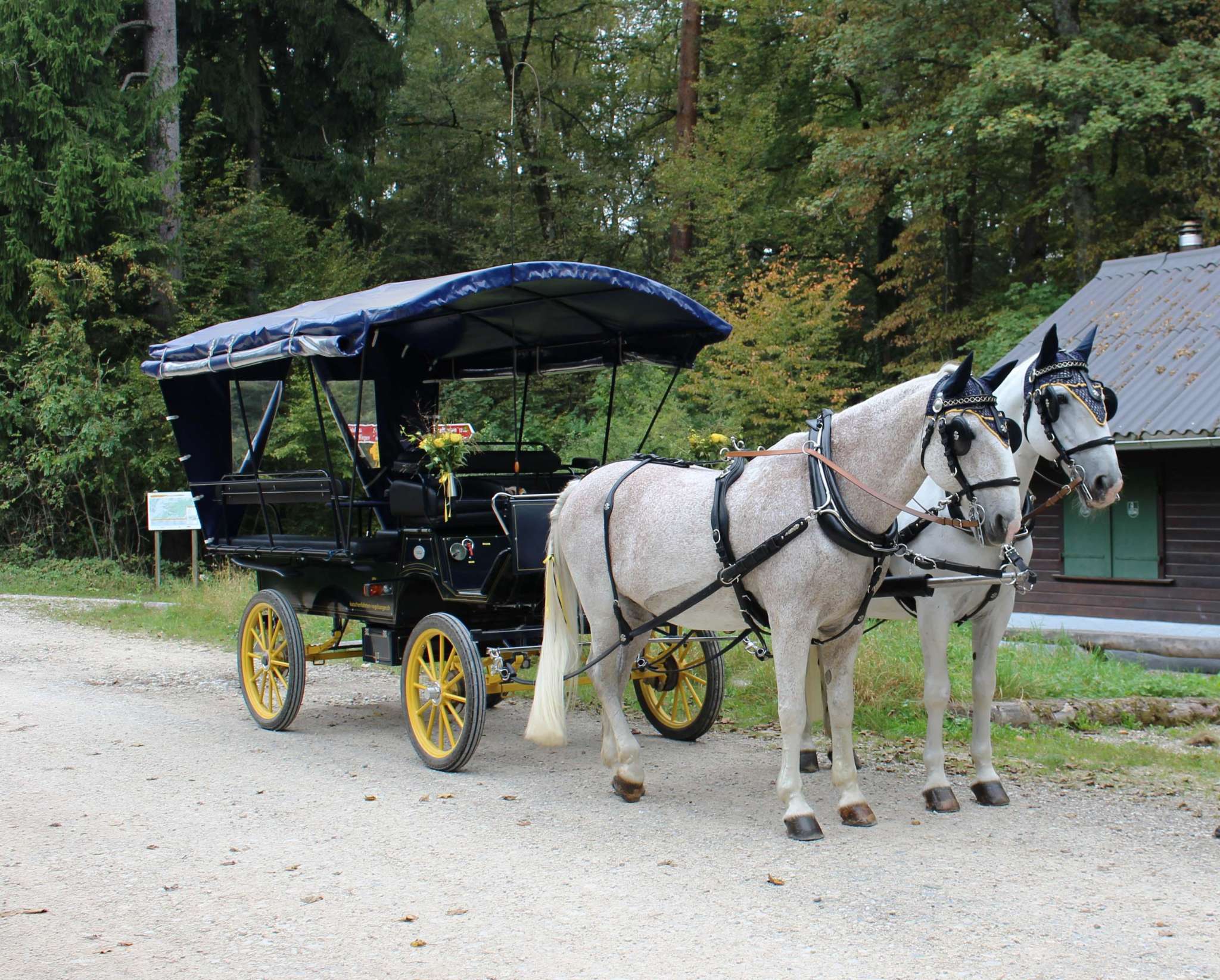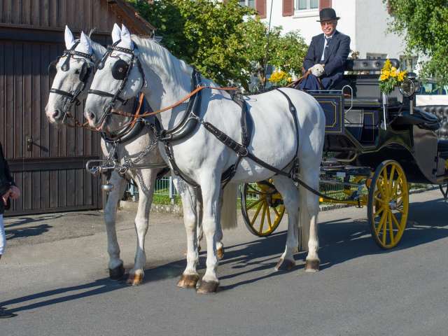 Sie geniessen bei uns vor der Abfahrt einen Apéro, während wir unser Schimmel einspannen. Wir fahren mit reinrassigen Kladruber Pferde, schönen Geschirren aus echtem Leder und original getreu nachgebauten Kuschen mit Scheibenbremsen.