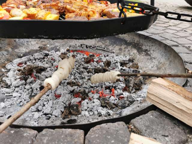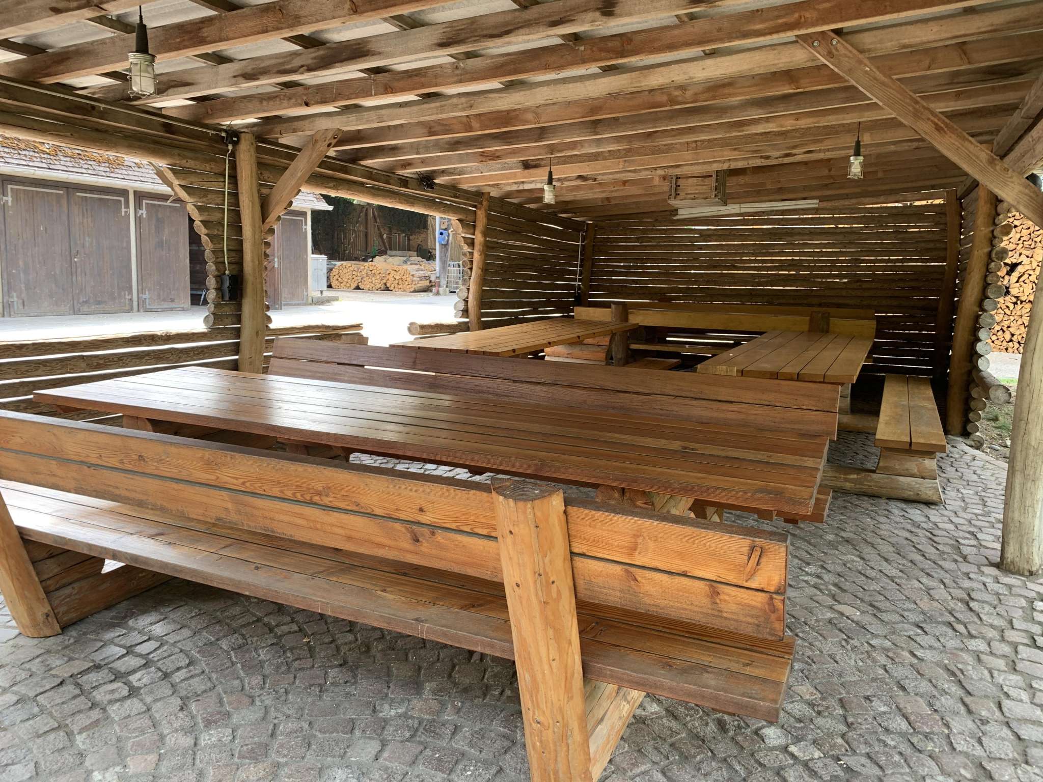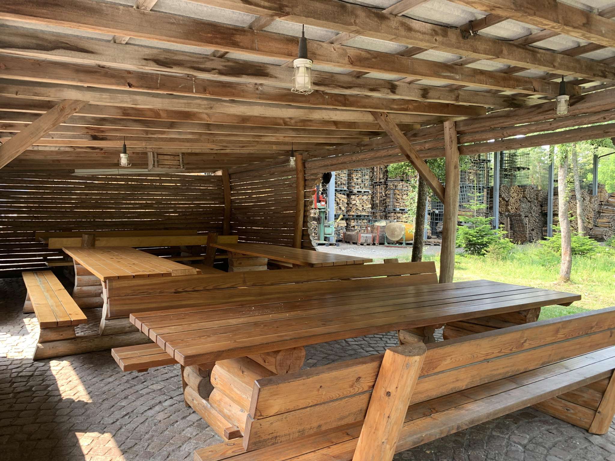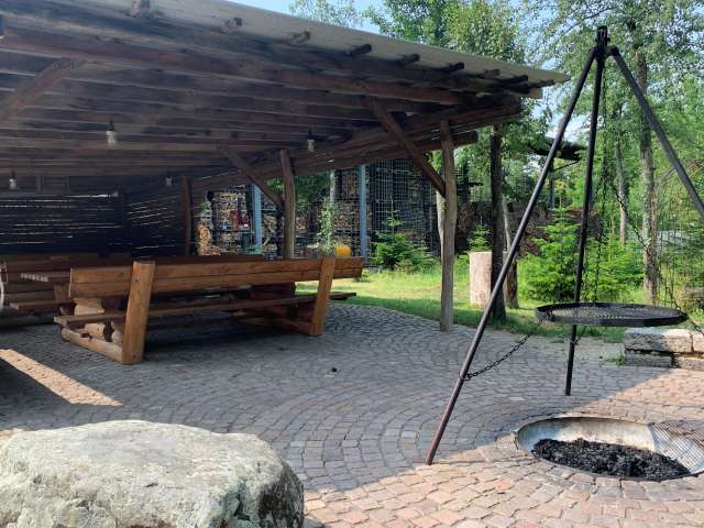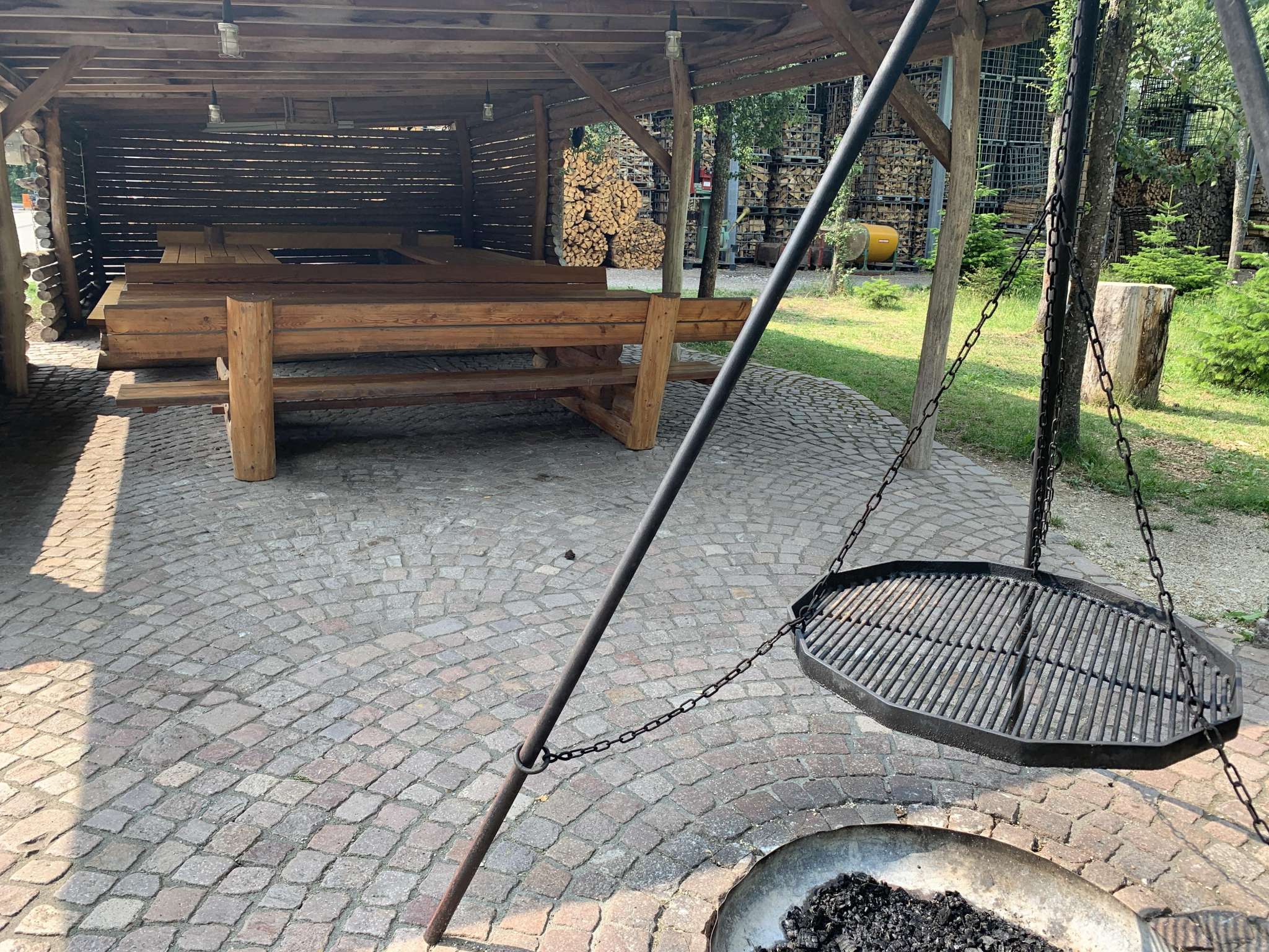 Gedeckter Sitzplatz beim Forstmagazin Engeweiher mit Grillstelle für 40 bis 50 Personen.