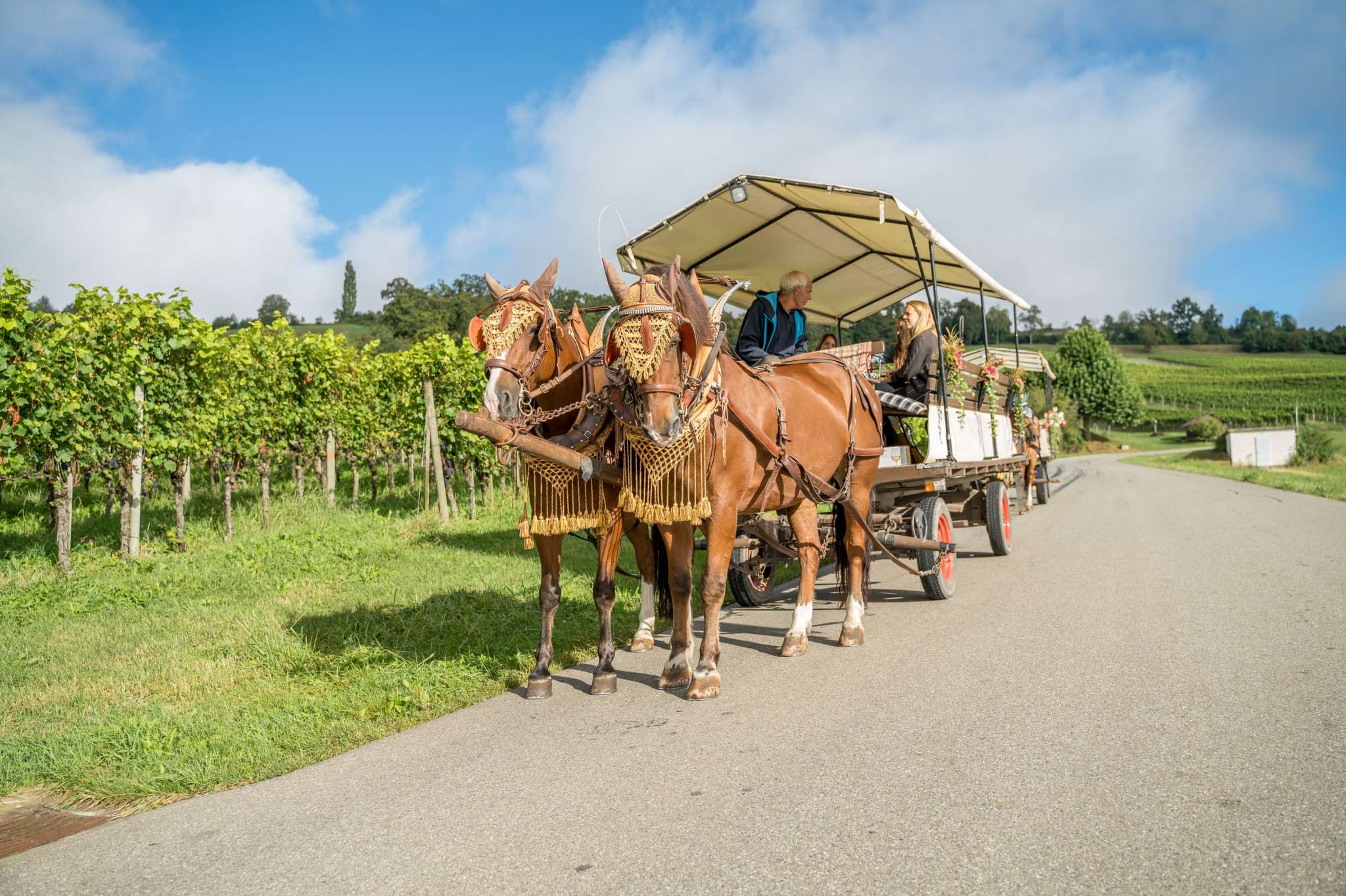 Geniessen Sie eine Pferdewagenfahrt durch die schönen Rebbergen im Schaffhauser Blauburgunderland.