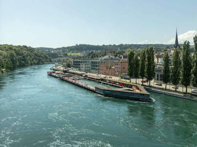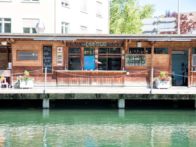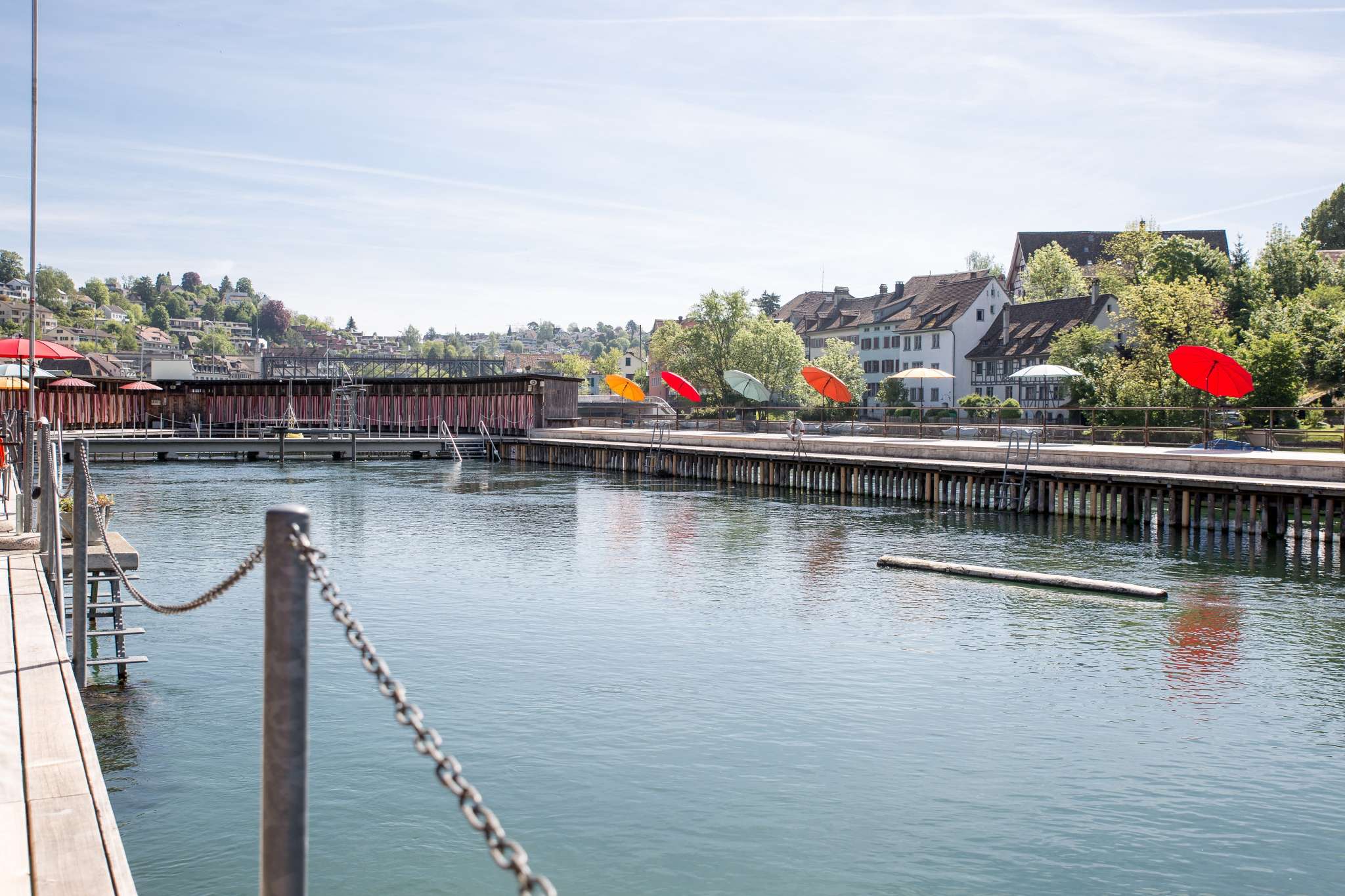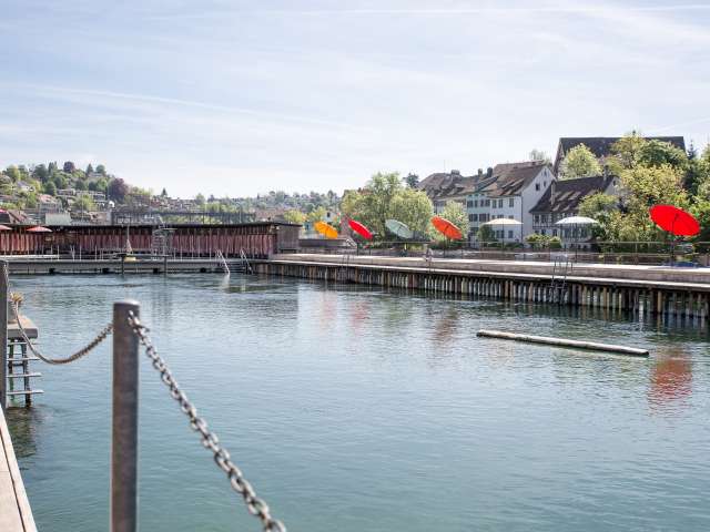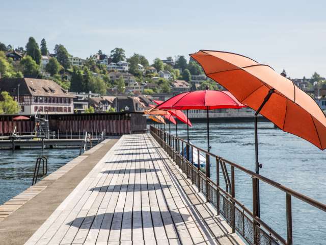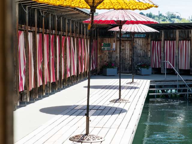 Historisches Flussbad mit Sprungbretter ca. 1 und 3 m hoch und verschiedenen Becken im Rheinwasser.