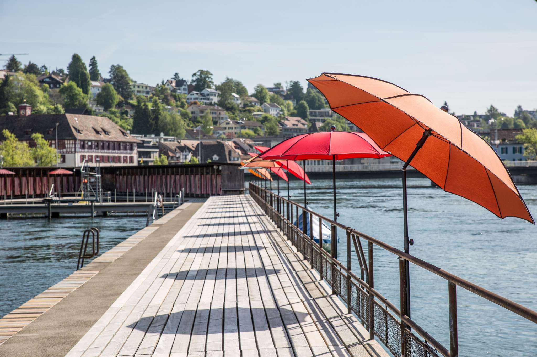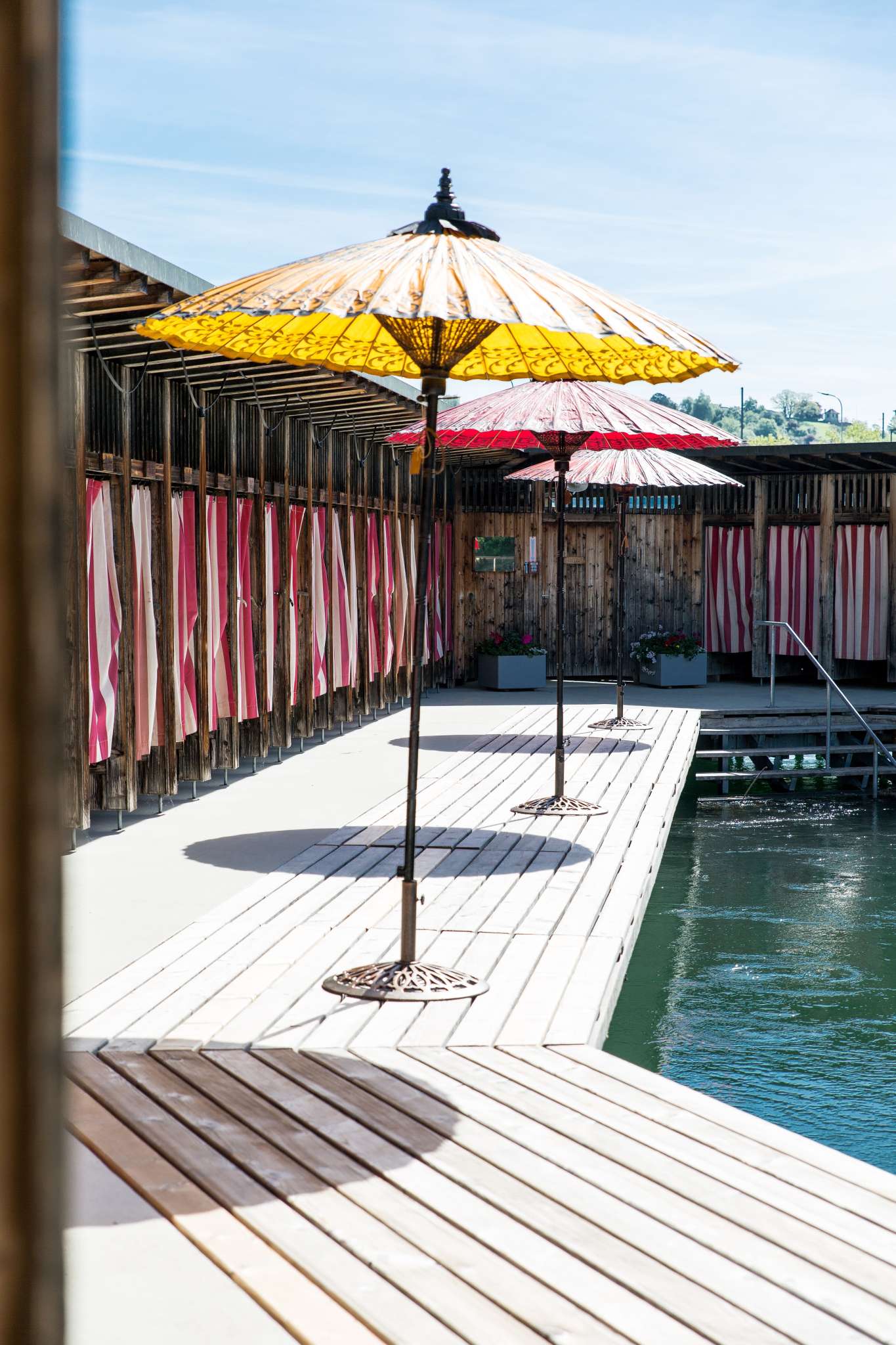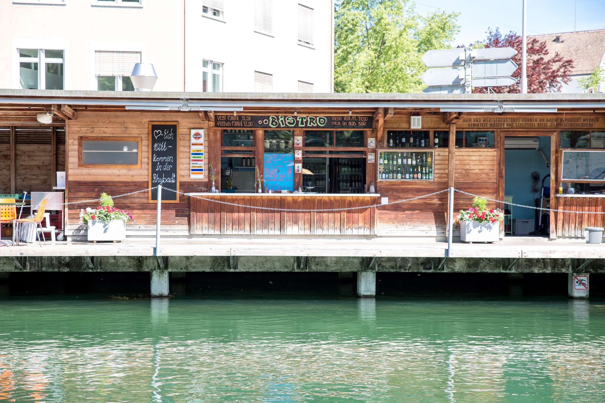 Historisches Flussbad mit Sprungbretter ca. 1 und 3 m hoch und verschiedenen Becken im Rheinwasser.