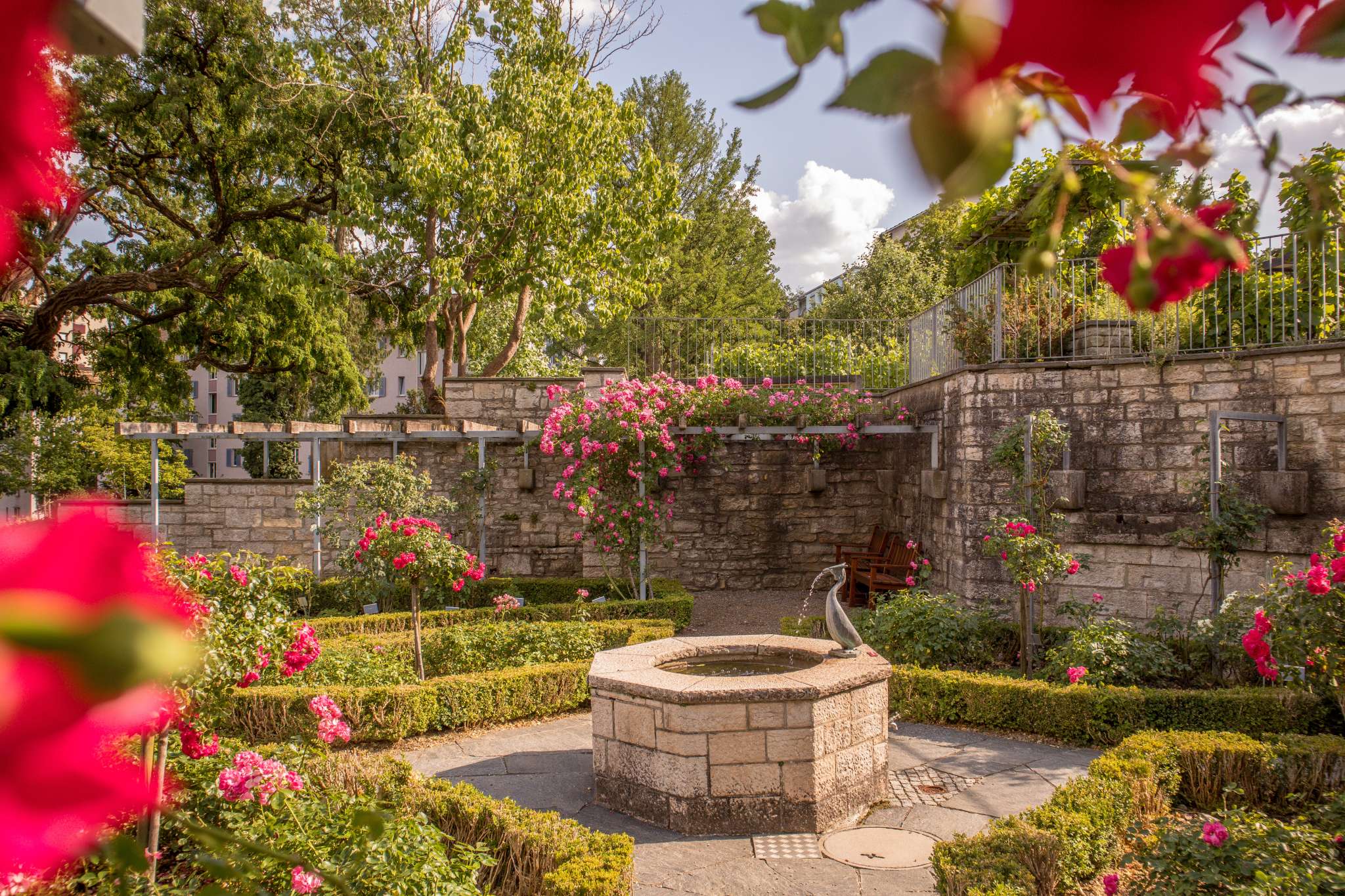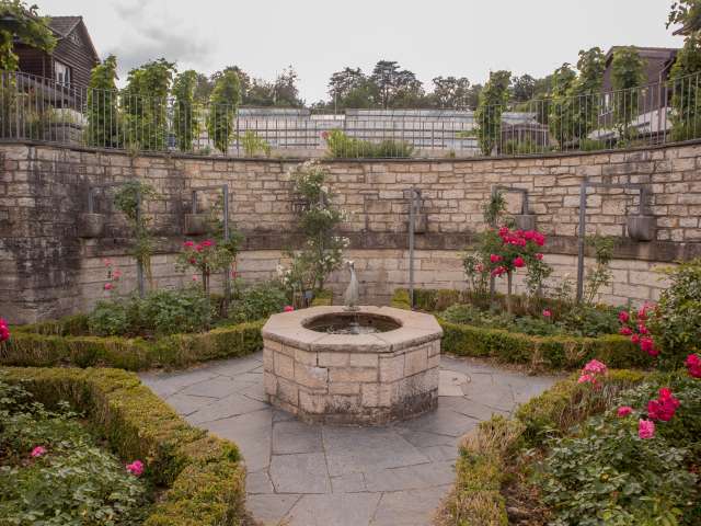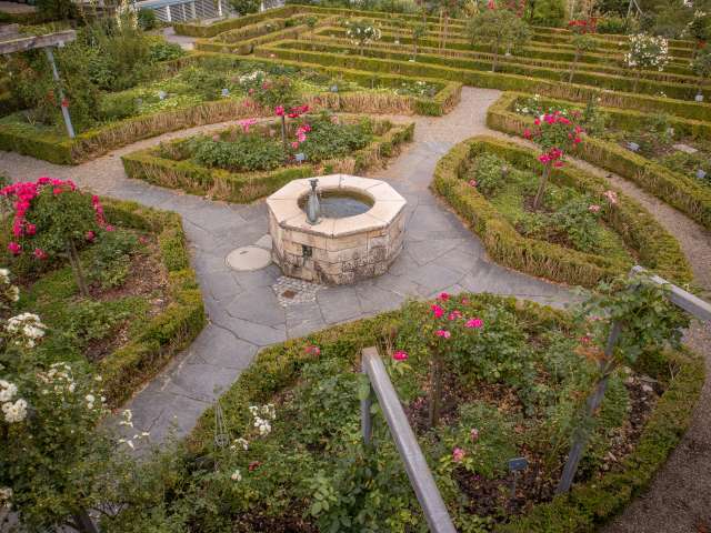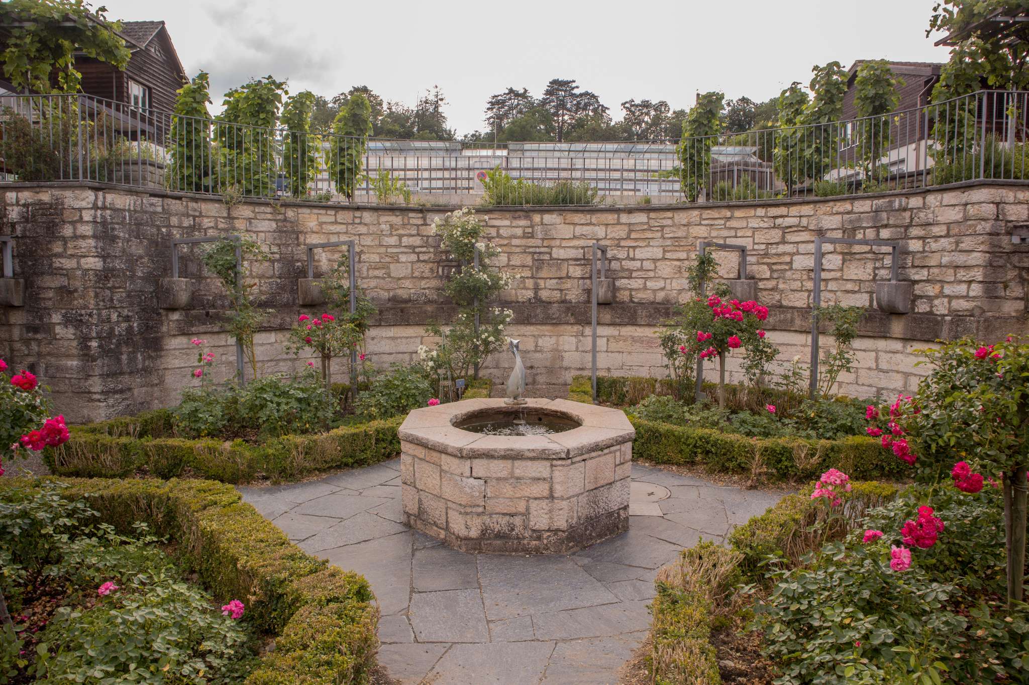 Der circa 300 Quadratmeter große Rosen- und Pfingstrosengarten wurde einst vom Schweizer „Rosenvater“ Dietrich Woessner als Stil- und Prüfgarten prächtig angelegt. Die Rosen wurden durch die Rosenfreunde Schaffhausen 2009 neu gepflanzt. Gleich unterhalb der Rosen wachsen seit 2014 über 90 verschiedene Pfingstrosensarten. Gleich beim Garteneingang wachsen Wildarten, aus denen zahlreichen Sorten gezüchtet wurden. Auch sind zehn Sorten zu sehen, die der 2006 verstorbene Engländer Sir Peter Smithers im Tessin gezüchtet hat.