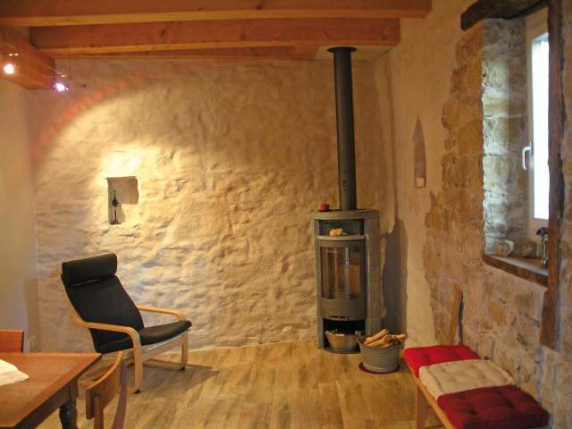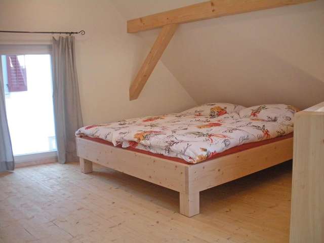 Gut ausgerüstete rustikale Ferienwohnung im ehemaligen Waschhaus in Wilchingen. Wohnraum mit Specksteinofen. Offenes Schlafzimmer mit Doppelbett und zwei Einzelbetten.