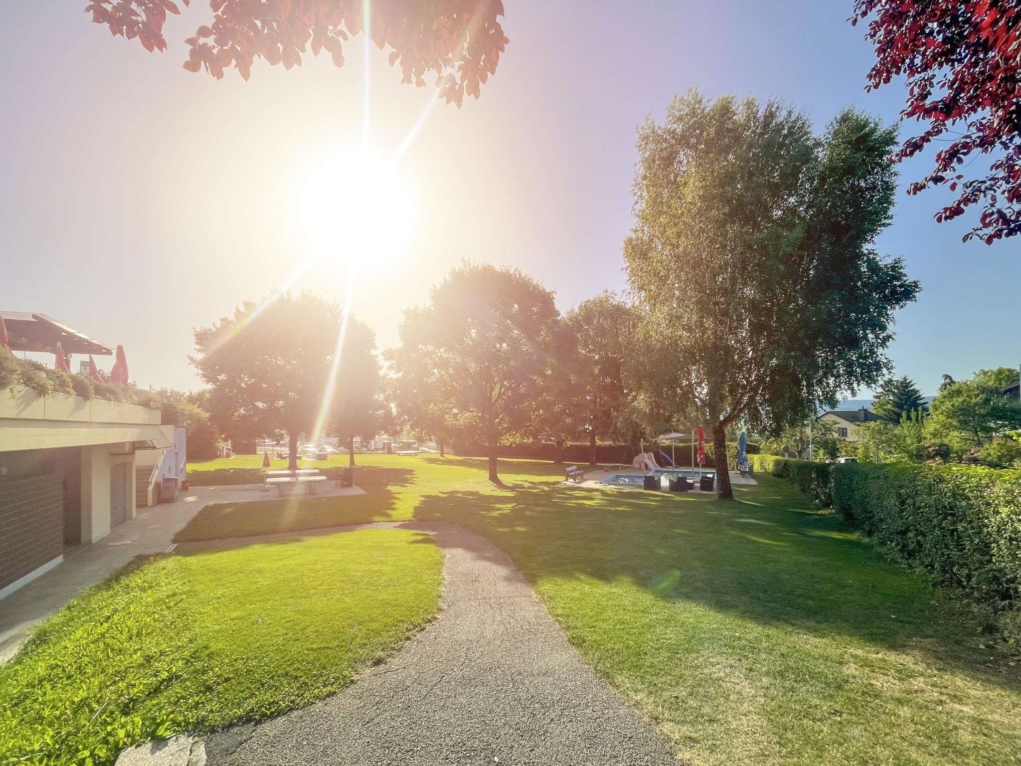 - grosse Liegewiese mit schattenspendenden Bäumen