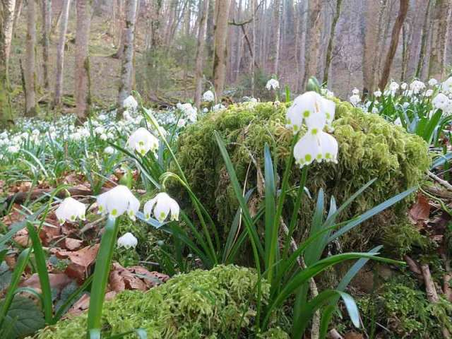 Im Frühling, kurz nach der Schneeschmelze, blühen im Waldgebiet des Naturschutzgebiet Auenwald die Märzenbecher zu Tausenden in voller Pracht.