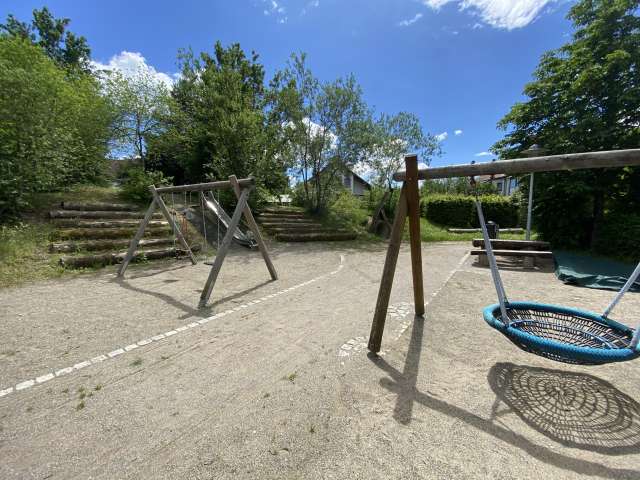 Spielplatz mit vielen spannenden Spielelementen für jedes Alter: Sandfläche, Tunnelröhre, Schaukeln, Rutsche, Balancierbereich und vieles mehr.