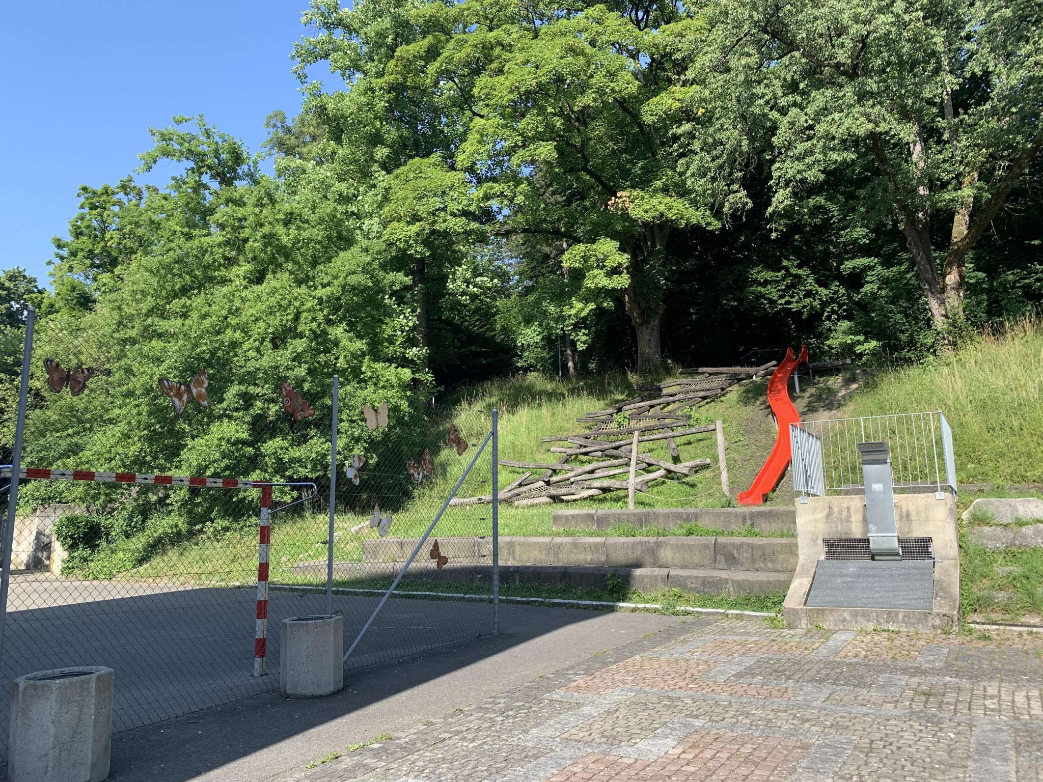 Neben einer Kletterstruktur und einer Rutschbahn hat es eine Hängematte und Schaukel. Auf dem Schulareal hat es zusätzlich einen Fussball-Hartplatz, Basketball-Hartplatz und Ping Pong Tische.