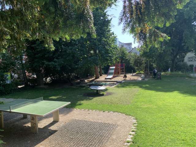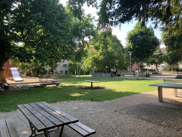 Dieser Spielplatz in der Schaffhauser Altstadt eignet sich perfekt für eine kleine Pause. Ein Klettergerüst, eine Rutschbahn, Wipp-Pferde, eine Schaukel, ein Sandkasten und ein Ping Pong Tisch laden zum Spielen und sich austoben ein. Zusätzlich hat es auch mehrere Tische zum picknicken oder um den Kindern beim Spielen zu zusehen. Auf der rechten Seite des Pavillons hat es eine öffentliche Toilette (Eingang um die Ecke an der Bachstrasse).