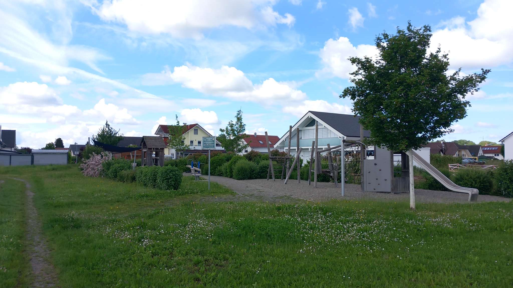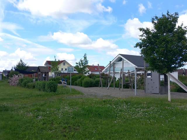 Spielplatz mit vielen spannenden Spielelementen für jedes Alter: Schaukel, Sandbereich, Rutsche, Spielturm und vieles mehr.