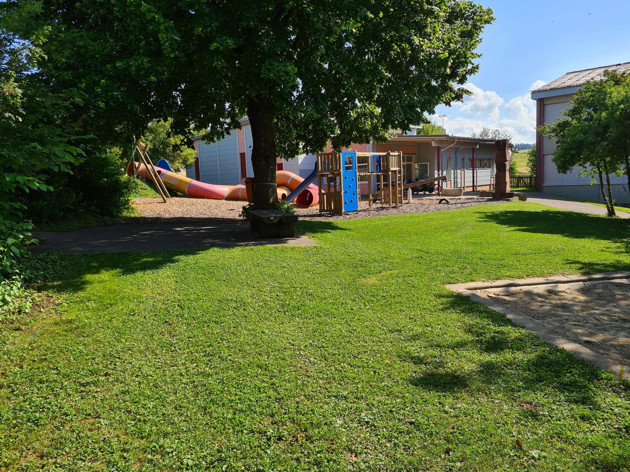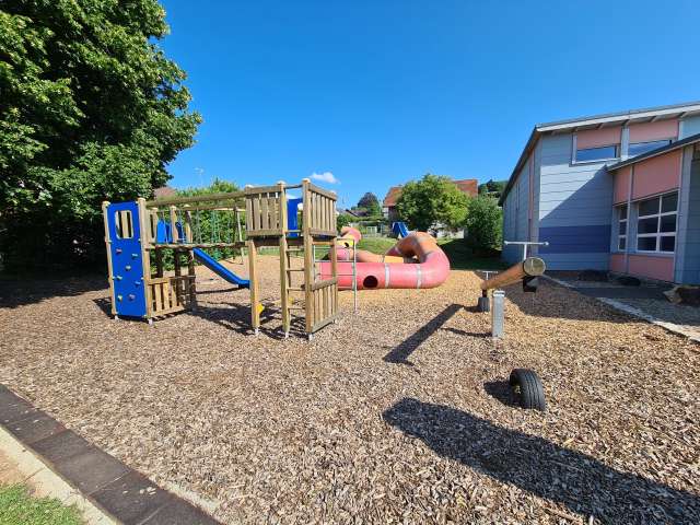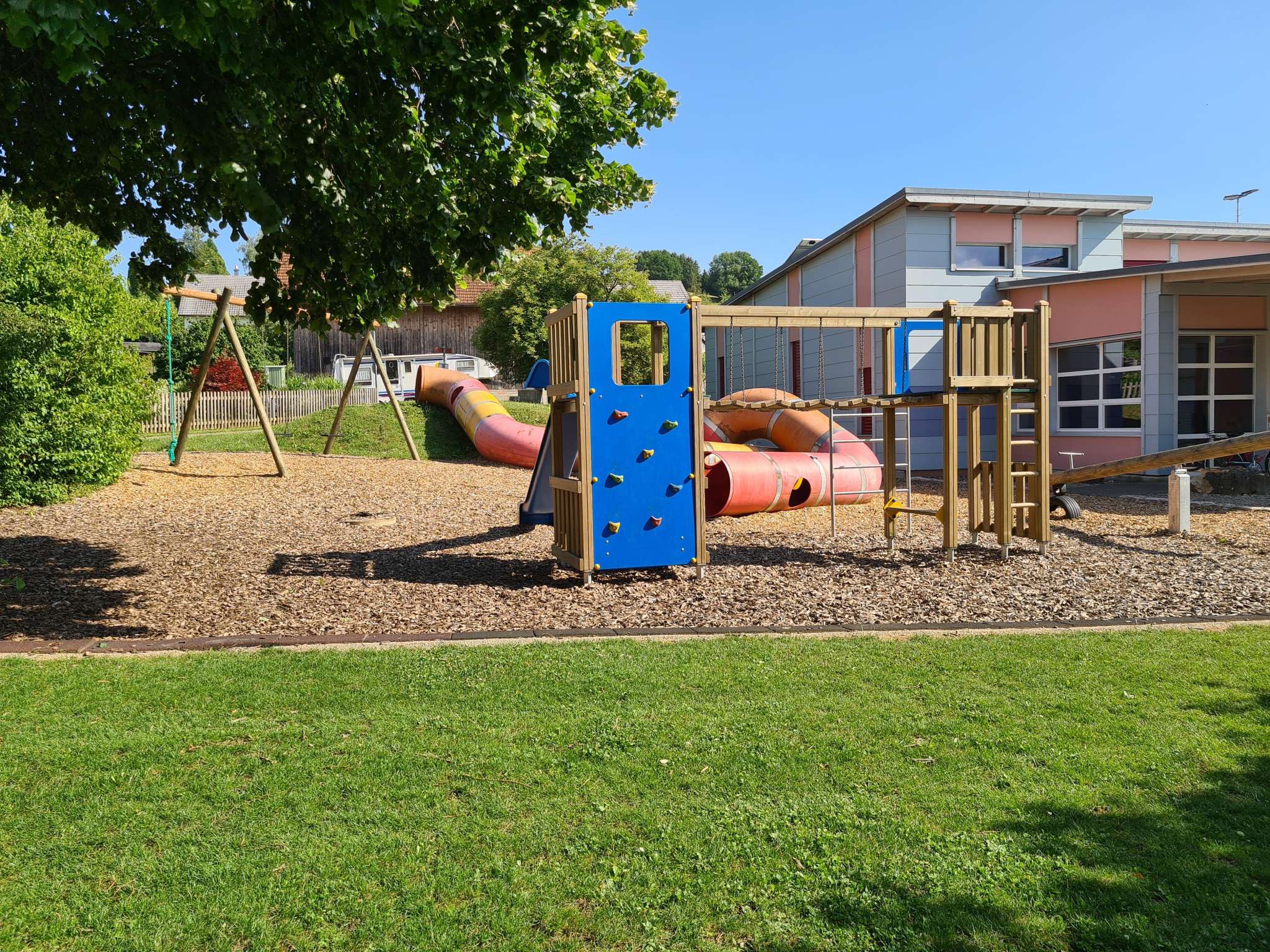 Eine Rutschbahn, ein Tunnel, ein Klettergerüst, eine Wippe und eine Schaukel lassen die Kinderaugen aufleuchten.