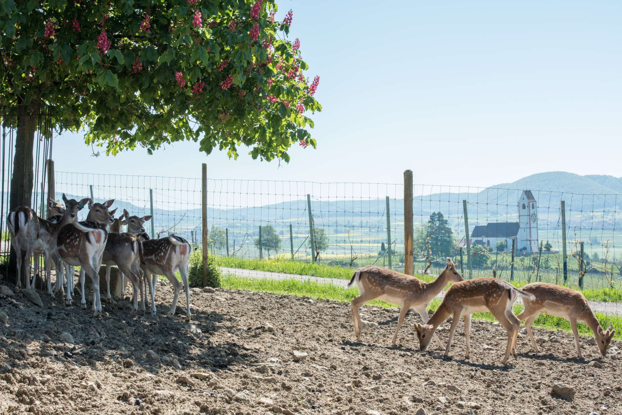 Zudem werden mitten im Rebberg von Hallau rund 60 Damhirsche gemäss den streng kontrollierten Vorgaben in weitläufigen Gehegen gehalten.